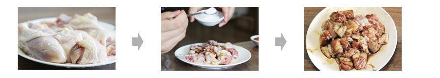2. Campur anggur masak, pati dan garam dalam panci, lalu rendam potongan2 ayam tadi ke dalam campuran selama setengah jam.